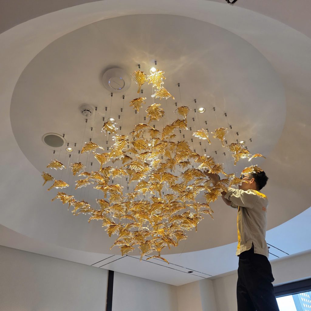 Trong thế giới của những không gian cao cấp, ánh sáng không chỉ để “soi sáng”, mà còn để kể câu chuyện về đẳng cấp, gu thẩm mỹ và giá trị công trình. Bộ đèn chùm lá phong nghệ thuật trong hình ảnh là một ví dụ điển hình – nơi thiết kế, vật liệu và kỹ thuật thi công hội tụ để tạo nên một tuyệt tác ánh sáng treo trần.