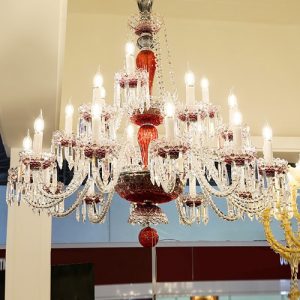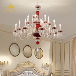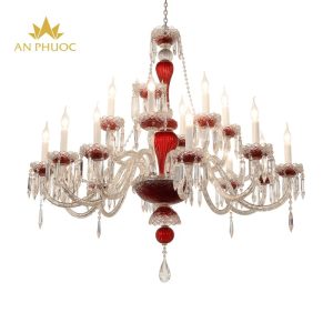 - Thủy tinh Murano đỏ kết hợp pha lê cao cấp tạo hiệu ứng ánh sáng huyền ảo, phản chiếu lấp lánh khi đèn được bật.